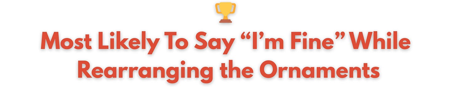 Winner: “I’m not doing that this year.” Simple. Elegant. Sparkly. The way those words unclench the jaw? Christmas miracle.