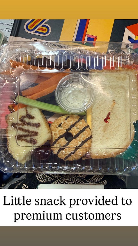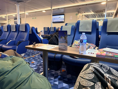 During check-in, we upgraded to premium seats which got us a dedicated area, a little snack situation, and enough space to actually move around like humans. And I will say — the ferry has amenities: a food and bar concession, a duty free shop, an outdoor balcony for fresh air, and charging ports.
