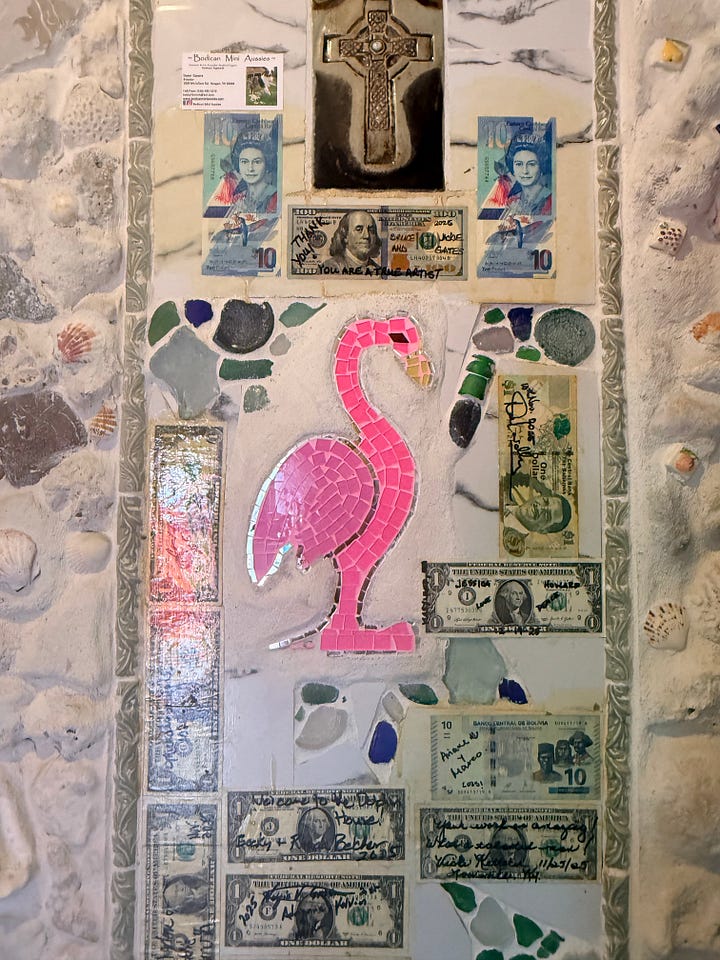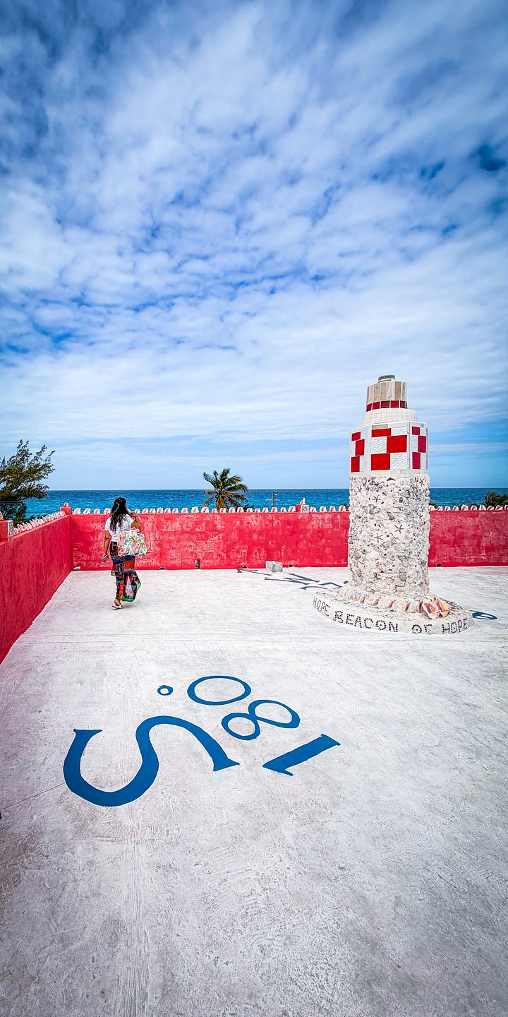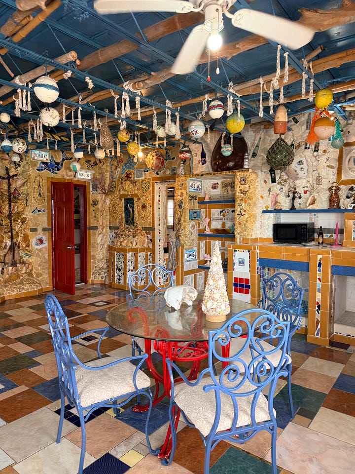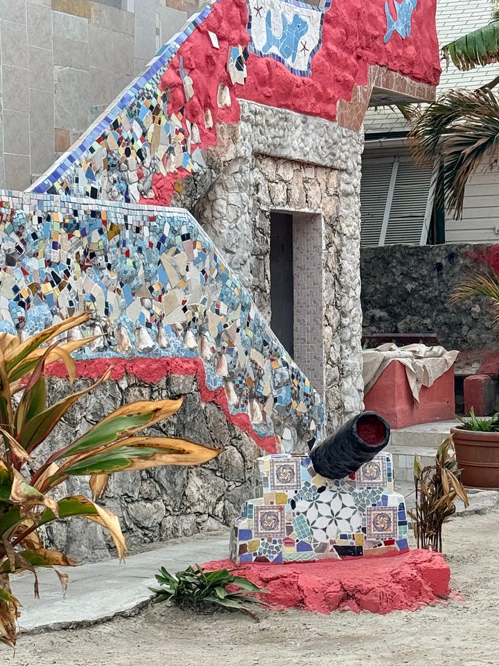 Dolphin House Museum: Do not skip this. It’s $20/person and completely worth it. The founder, Sir Ashley Saunders, is a published author and local legend who built the entire house himself over decades — covered floor to ceiling in dolphin mosaic art and found objects. He gives you a personal introduction and answers every question. It’s weird and wonderful and totally unique. We saw a few other groups while we were there but the tour flows so you never feel crowded.