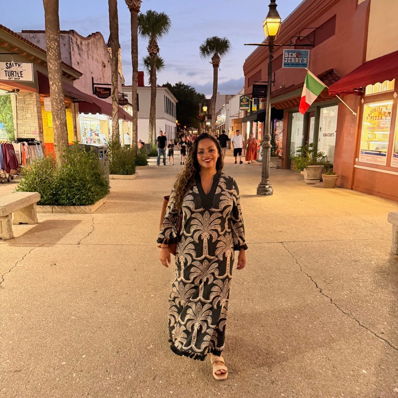 To me, St. Augustine style feels like soft gothic meets coastal sparkle - equal parts historic charm and seaside ease. Think black florals, flowy dresses, glowy skin lit by lantern light, and metallic flats that can handle cobblestones. It’s one of those cities where you might pass a centuries-old mansion on your way to a cute beach café, so your outfit kind of needs to live in both worlds: romantic, a little mysterious, but still breezy and walkable.
