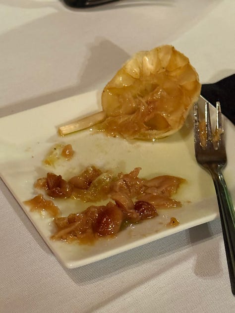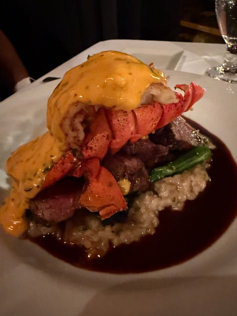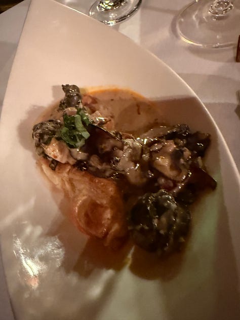 We started with Escargot and the Scallop Saltimbocca (scallops wrapped in prosciutto and sage). They brought complimentary grilled garlic, a fun change from bread and butter, then Speed had the Collage Surf and Turf (tenderloin + Maine lobster tail) while I had the Homemade Lobster Ravioli. We finished with our go-to crème brûlée (and forgot the photo, of course!). Total mouthgasm worthy and one of our Top 5 meals EVER. It was a magical little spot! We left full, happy, and a little bit proud we found it.