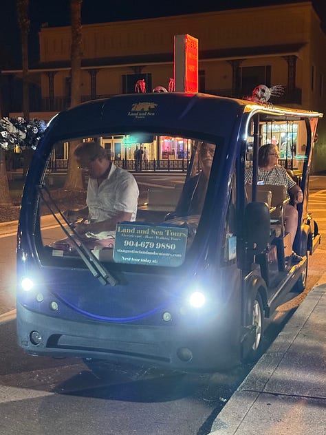 You can’t visit St. Augustine without doing at least one ghost tour. It’s practically a rite of passage. I’ll admit, I’m not really into spooky stuff either, but we found a low-scare, high-fun option that totally worked for us: the Riding with the Ghosts a Golf Cart Ghost Tour in St Augustine at 9:15 pm.