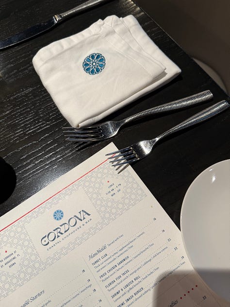 Talk about colorful! The historic Casa Monica Resort & Spa feels like you stepped into a Spanish-Moorish dream. Arched doorways, velvet textures, and just enough moody glam to make you believe you own 14 caftans and a crystal decanter set. Next time we’re in St. Augustine, we’re definitely staying here. We did have lunch at the hotel restaurant, Cordova Coastal Chophouse, and the ambiance was incredible.